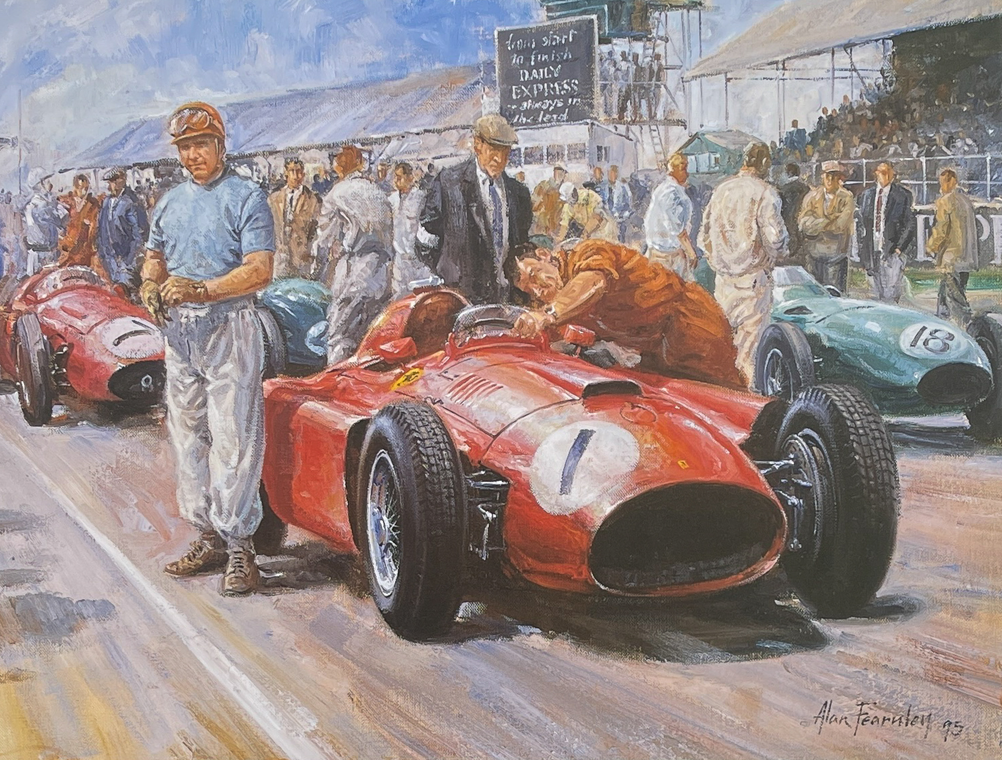 Produced and signed by the Artist in 1995 and depicts Juan Manuel Fangio with his Lancia-Ferrari D50 prior to winning the 1956 British Grand Prix at Silverstone.