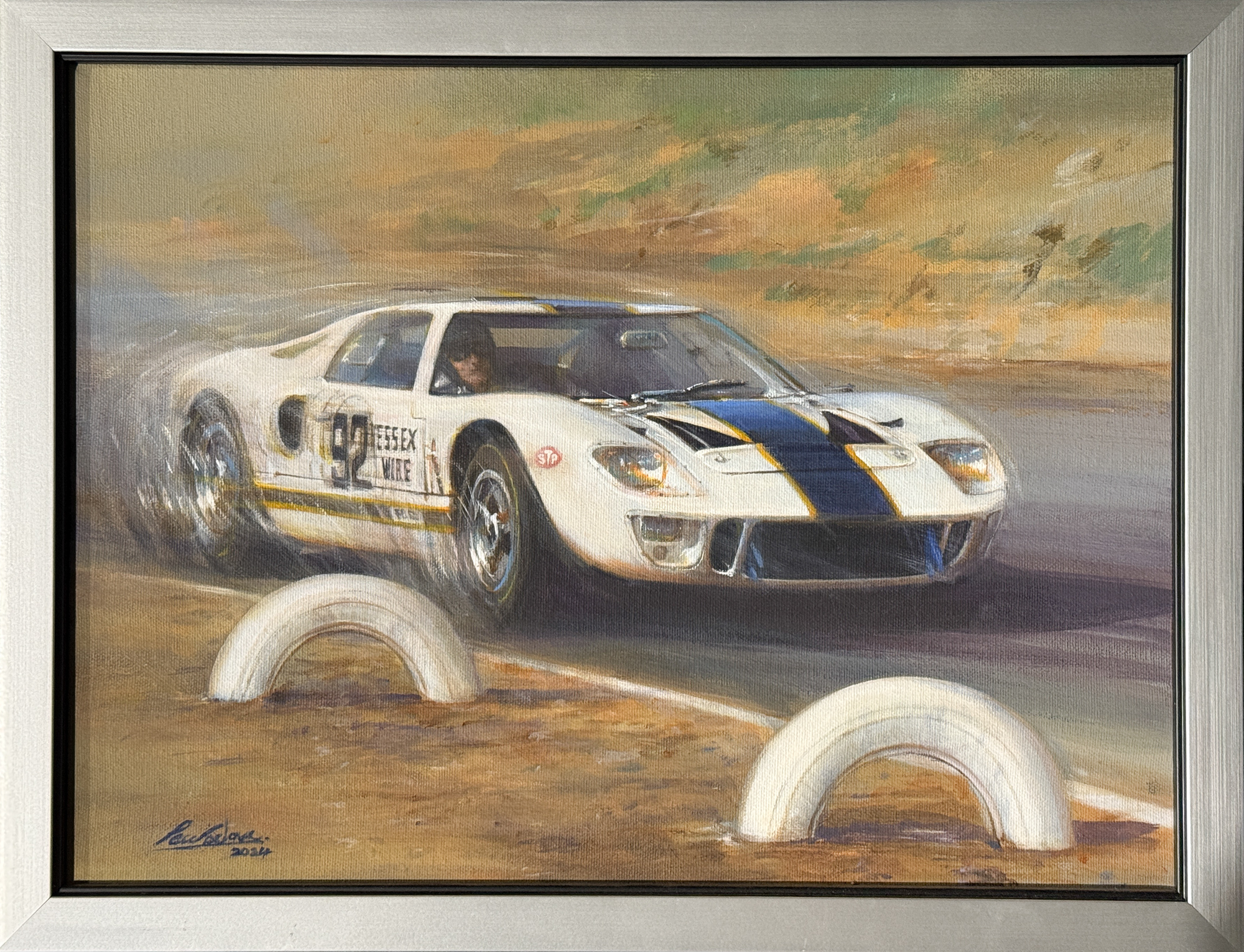 This Original painting captures Miles in motion—car number 92, white with blue and yellow Essex Wire livery—evoking the raw speed and drama of early Can-Am racing. Though not victorious, the race marked a key chapter in the GT40’s evolution and Miles’ legacy.