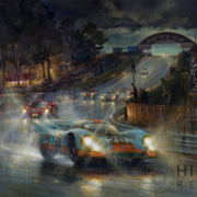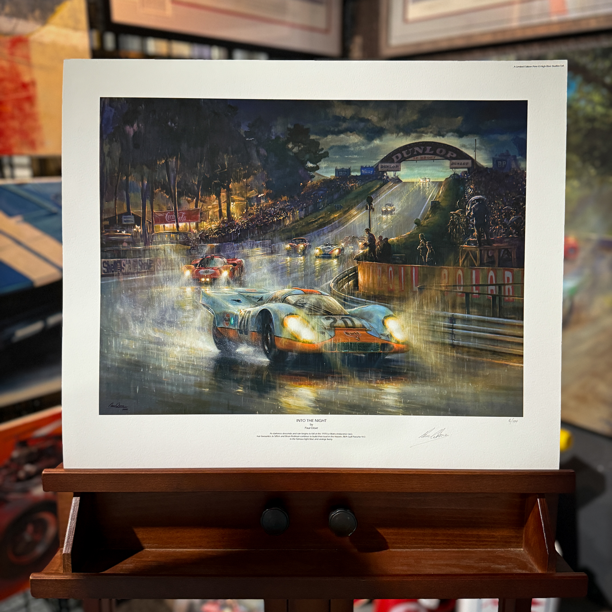 As darkness descends and rain begins to fall at the 1970 Le Mans endurance race, hot favourites Jo Siffert and Brian Redman continue to build their lead in the historic JWA Gulf Porsche 917, in the famous light blue and orange livery.