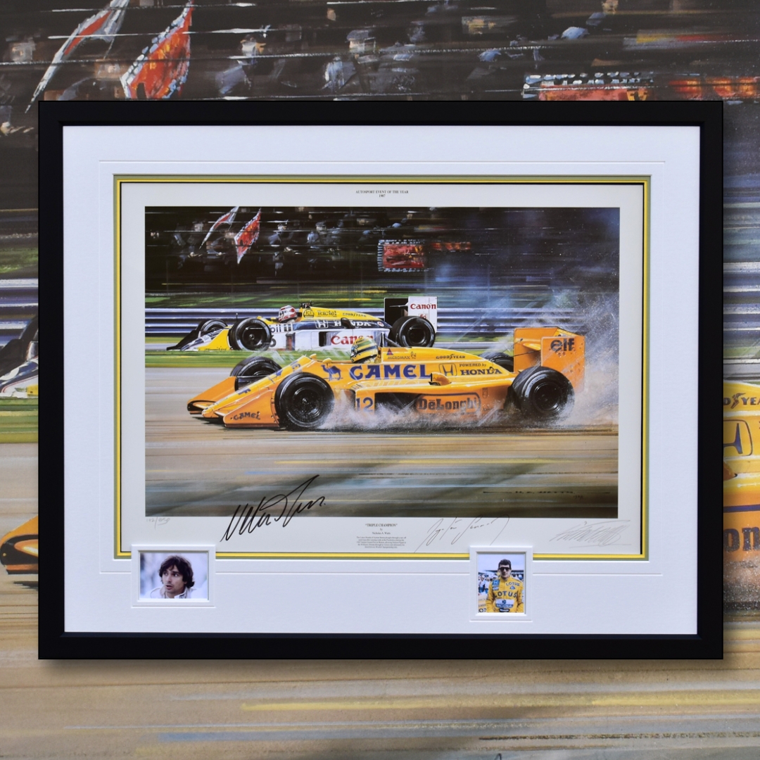 Personally Signed & Numbered by artist Nicholas Watts and the World Champions, Ayrton Senna & Nelson Piquet. The original edition was limited to 850 copies worldwide.
